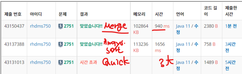 - 퀵 정렬은 오히려 시간이 오래 걸려 시간 초과가 나타났다.