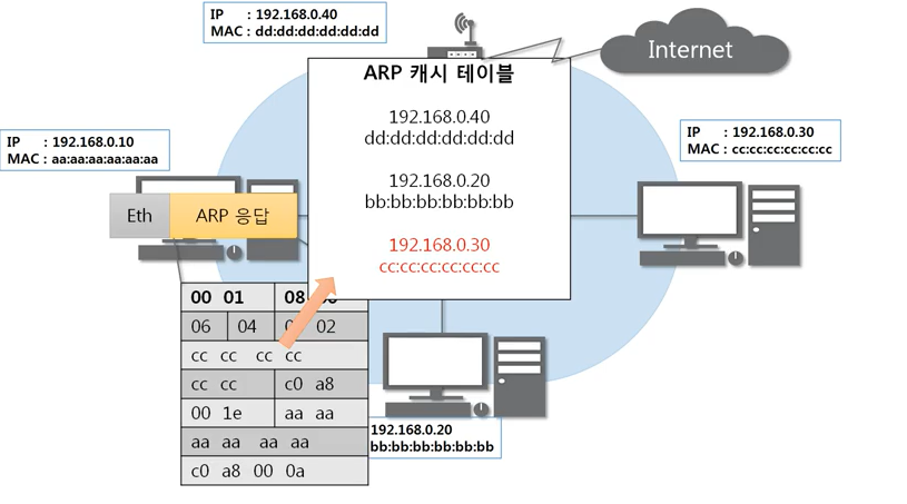 - 출발지 및 목적지의 MAC주소와 IP주소가 페이로드에 작성되어 있음