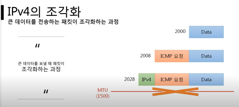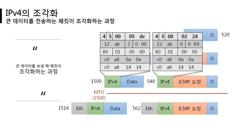 * 조각화를 할 때에는 MTU에서 IPv4프로토콜만큼을 제외하여 데이터를 조각낸다.
