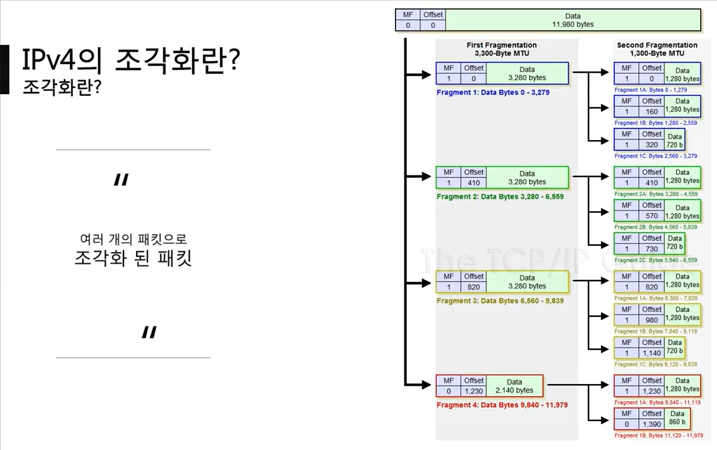 (ex. 아래의 경우 MTU가 3300byte이며, IPv4가 20byte가 필요하므로 데이터를 3280bytes씩 조각화한다)