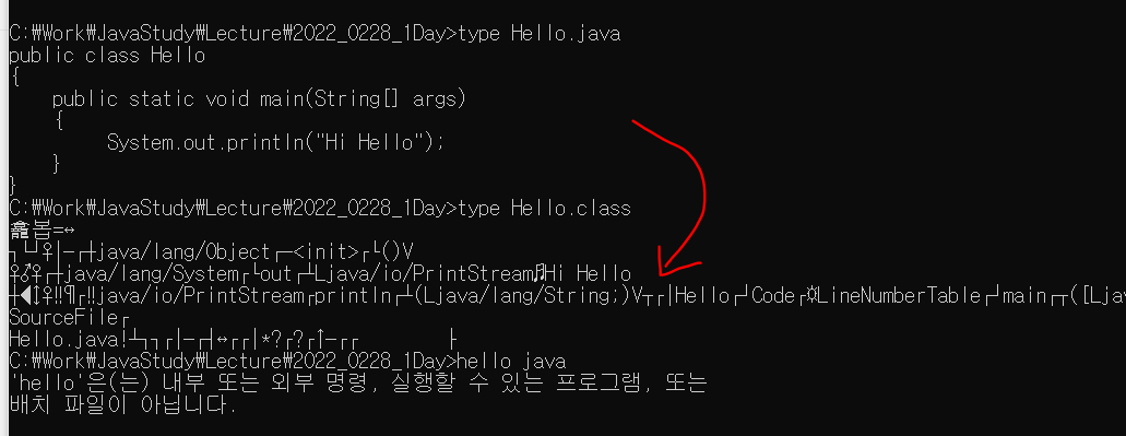 - 아래를 보면 type Hello.java를 했을 땐 소스코드를 볼 수 있고,
