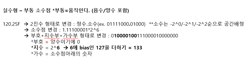 | 실수형 | float | Float | 4 | 10^-38~10^38 *정밀도 6-7 | O | %f | 0.0f | |