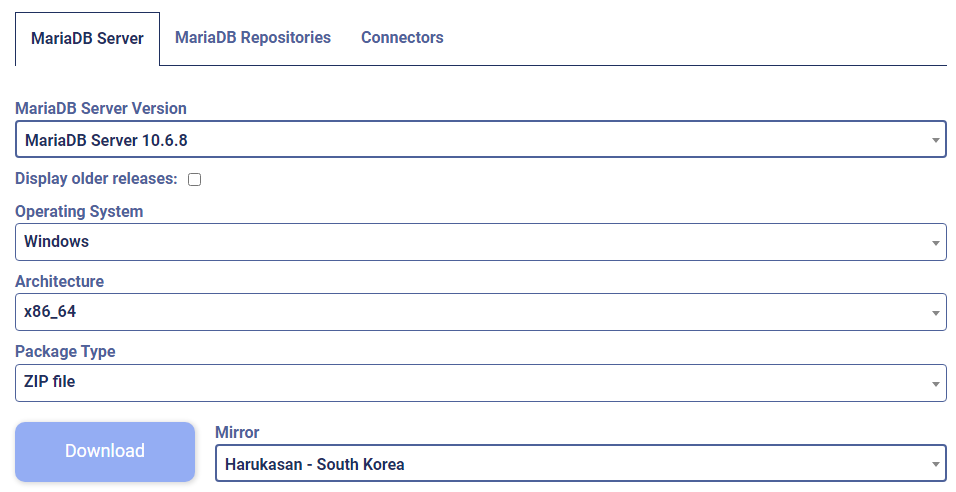 - MariaDB 사이트에서 버전 확인 후 가이드에 따라 설치파일 다운로드[바로가기]