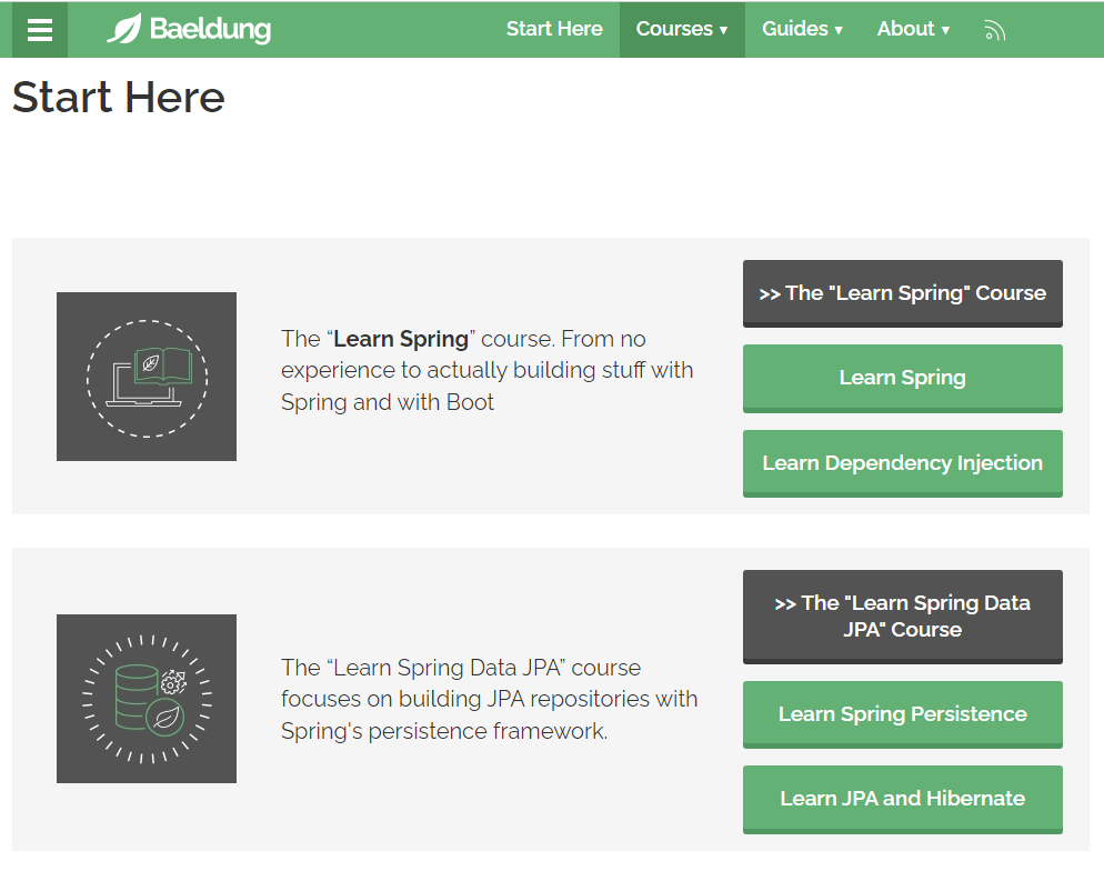 - Baeldung의 Start Here페이지이다. 튜토리얼을 제공하고 있는데 일반 코스에서 시큐어 코딩, REST API까지 다룬다.
