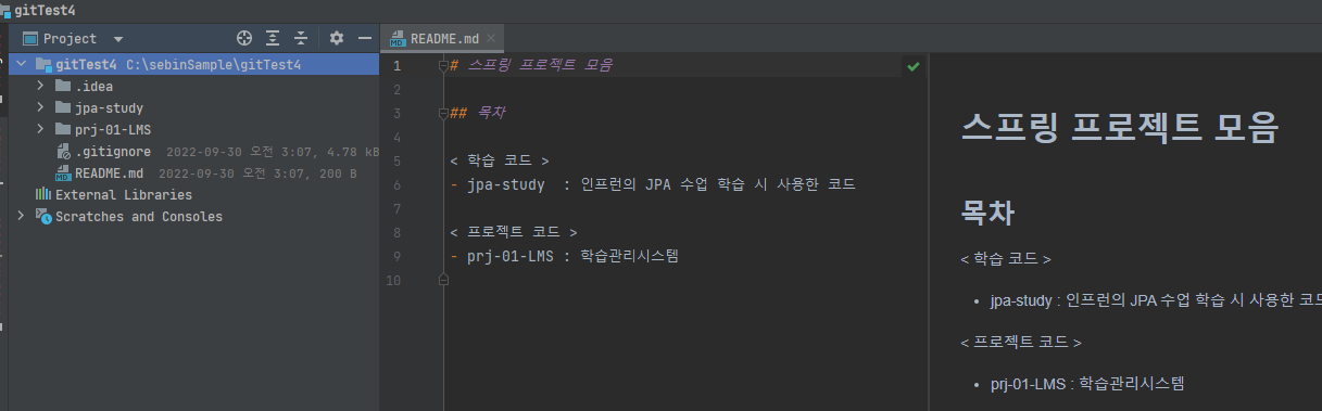 클론이 잘 되었다. 아래를 보면 알 수 있지만 인텔리j는 마크다운 언어를 이미지로 뷰로 바로 볼 수 있기도 하다.