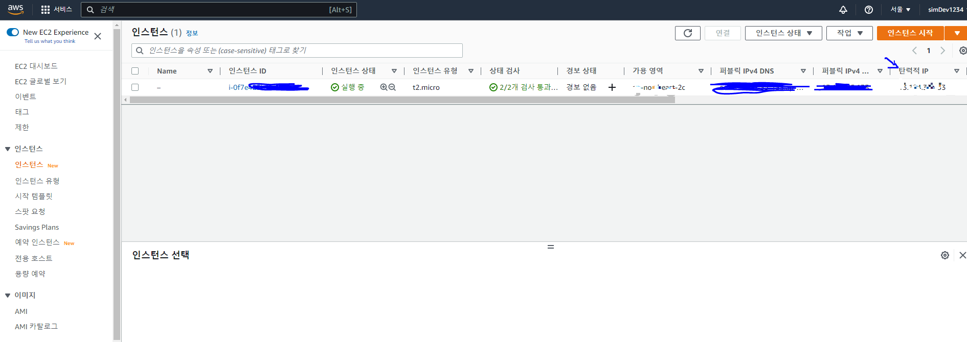 - 프리티어의 경우 하나의 인스턴스를 실행 시켜둘 수 있는데, 하나를 만들어두었고, 탄력적 IP를 설정해두었어요.