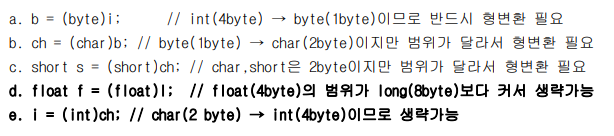 *실수형 <- 정수형 : 실수형의 저장범위가 정수형 보다 커서 자동형변환 가능 (그러나 정밀도가 다르므로 유의)