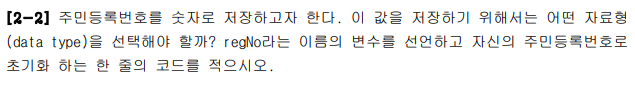 [ 해설] 정수형 타입으로는 보통 int형을 사용하지만 주민등록번호는 13자리의 정수이기 때문에 int형의 범위를 넘어서는 값이다 그래서 형을 사용해야한다 그리고 리터럴 'L' 의 접미사 을 잊어서는 안된다.