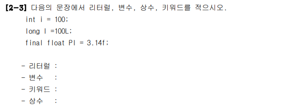 - 리터럴 : 100, 100L, 3.14f