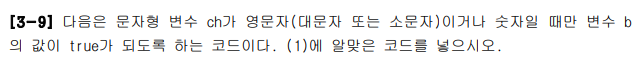 답 : (ch >= 'A' && ch <= 'Z') || (ch >= 'a' && ch <= 'z') || (ch >= '0' && ch <= '9')