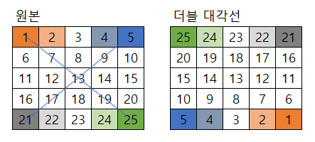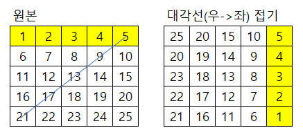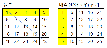 | [원리] *표시한 노란색 기준 - 왼쪽의 행이 오른쪽 열로 바뀌었다. - 왼쪽의 행은 0~4순번이며, 오른쪽 열도 0~4순번이다. |