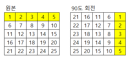 | [원리] *표시한 노란색 기준 - 왼쪽의 행이 오른쪽 열로 바뀌었다. - 왼쪽 행의 0번째가 오른쪽 열의 4번째가 되었다. - 왼쪽 열은 0~4순번으로 간다. 오른쪽 행은 4~0순번이다. |