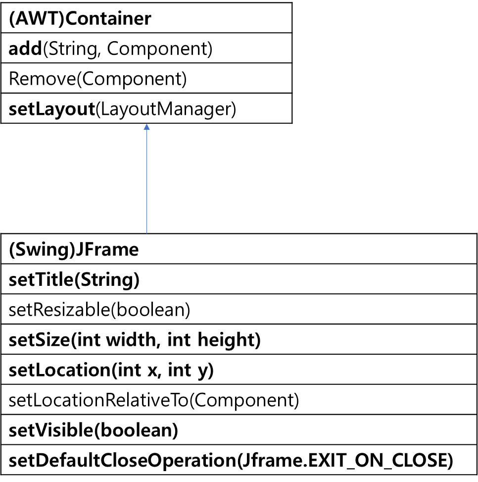 - Container 상속 : 컴포넌트를 추가(add)/지우기(remove), 컨테이너 내 배치방식(Layout) 설정