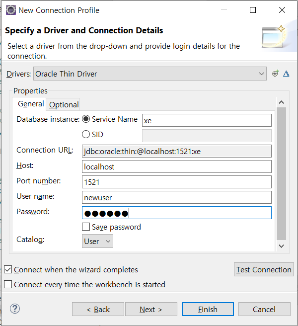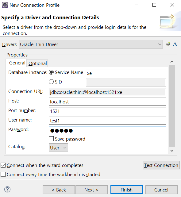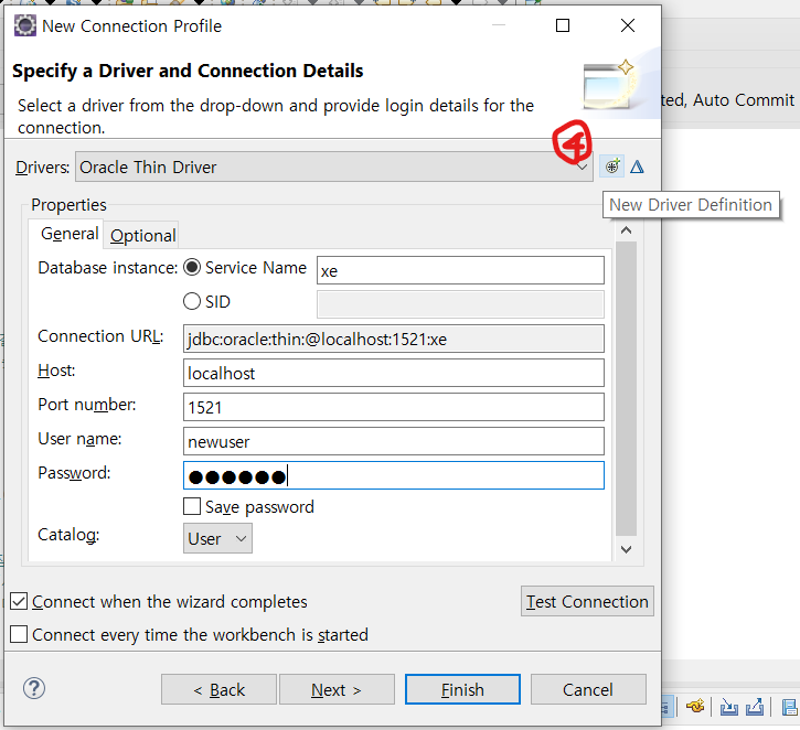 [6] [New Connection Profile]으로 재이동 후 Properties 작성 후 [Test Connection] 선택