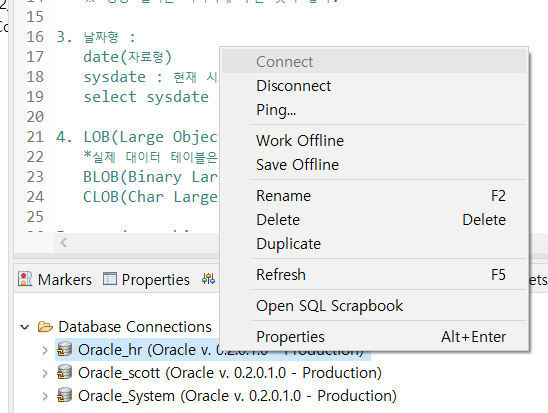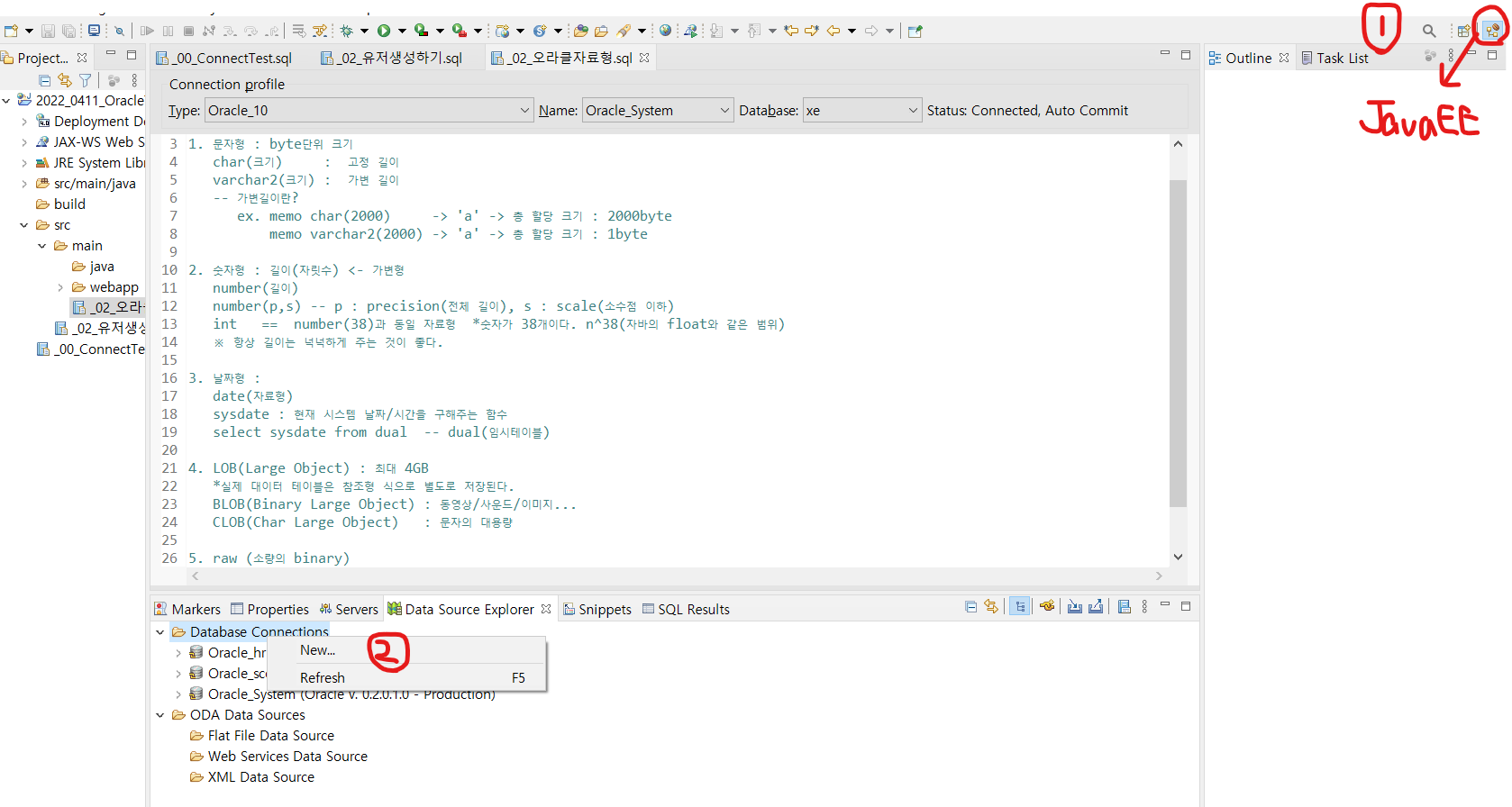 [2] 하단의 [Data Source Explorer] 탭 > [Database Connection] 폴더 선택 후 마우스 오른쪽 > new