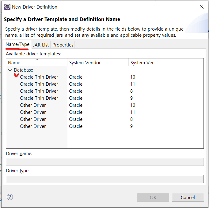 - [Name/Type] Oracle Thin Driver의 나의 오라클 버전(10) 선택