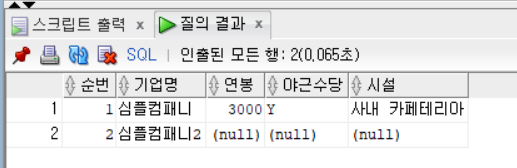 - 심플컴패니2에 해당되는 연봉, 야근수당, 시설을 입력한 적이 없는데, 심플컴패니에 해당되는 부분이 추출됐다.