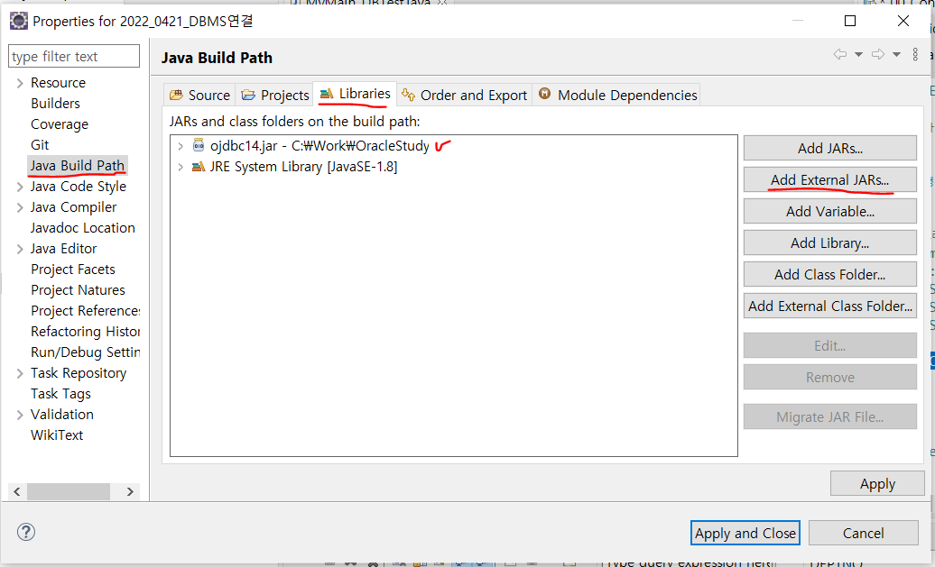 - 프로젝트 생성 시, jdbc.jar파일 경로를 입력하기