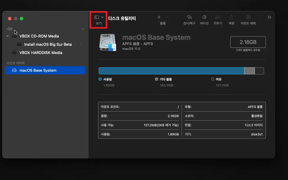 [2] Mac OS 설치 전에, [유틸리티] - [디스크 유틸리티]에서 [보기] 버튼을 클릭, "모든 장치 보기" 또는 "Show All Devices" 선택