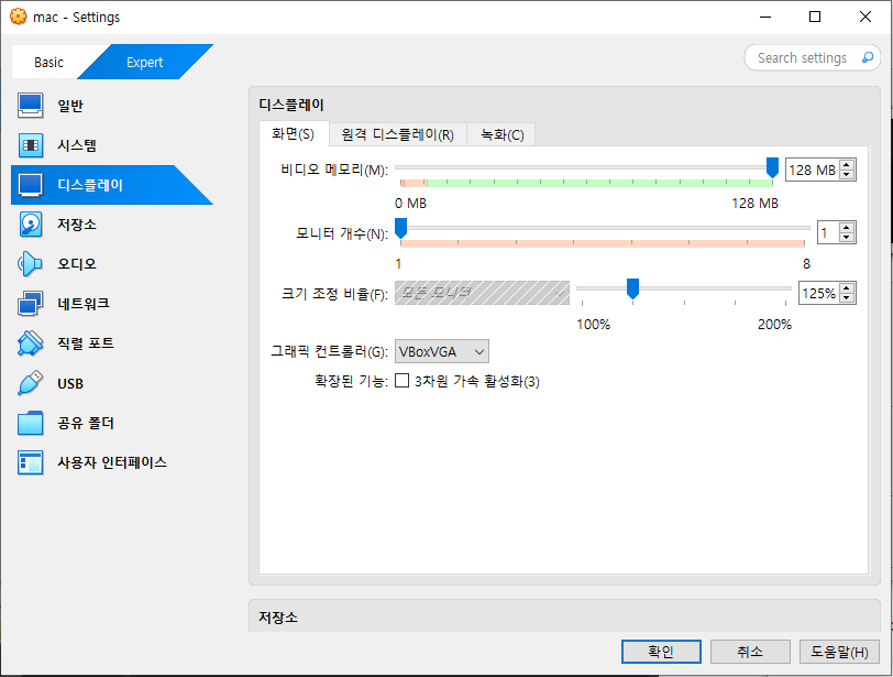 [3] [디스플레이]-[화면] 에서 "비디오 메모리"를 128MB로 수정, 그래픽 컨트롤러도 VBoxVGA를 사용한다.