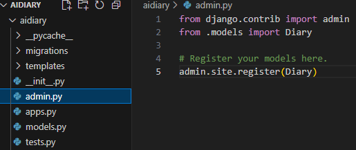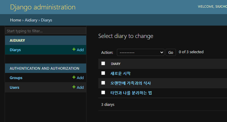 App 폴더 하위에 보면 admin.py 파일이 있어요. 거기에 위처럼 admin.site.register(Diary) 요렇게 생성한 모델을 적용해두면, 어드민 페이지에 Diary에 대한 CRUD 작업을 할 수가 있습니다.