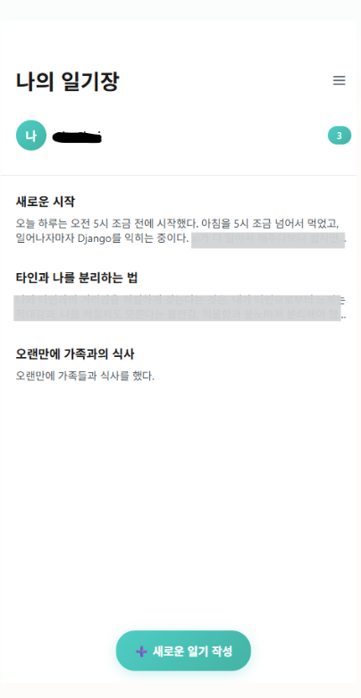 책에 나와 있는대로 저는 모델 - 템플릿 - 뷰 - url 순서로 다이어리 프로젝트를 만들어봤어요. 이전에 스프링으로 구현을 해봤어서 따로 설계는 필요 없었기에 여러 사이트에서 디자인 아이디어를 찾아 AI를 활용하여 Html 템플릿을 만들어보았습니다. 현재까지 구현된 바는 아래와 같아요.