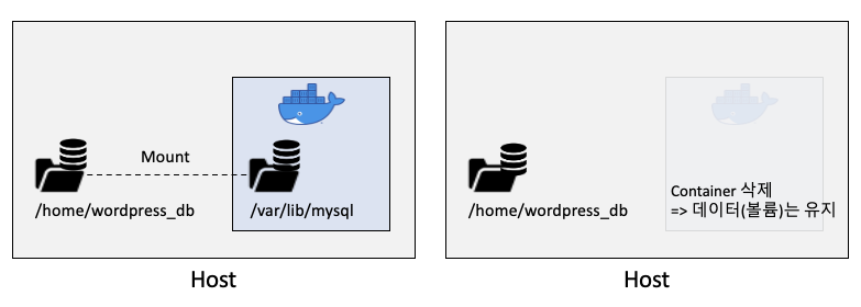 * mysql의 데이터는 기본적으로 /var/lib/mysql 경로에 저장하는데, Docker 컨테이너 안의 /var/lib/mysql 에 데이터가 저장되어, 컨테이너를 삭제하면 /var/lib/mysql 데이터가 유실된다. > 이를 막기 위한 방법은, 컨테이너와 독립적으로 데이터를 저장하는 것이다. 이때, 볼륨이라는 개념을 이해해야하는데, 볼륨은 운영체제에서 논리 드라이브(local drive)라고도 불리는 것으로, SSD와 같은 물리 드라이브와 달리 논리적으로만 존재하는 드라이브를 말한다. 대표적으로 C드라이브가 이 볼륨에 해당된다. > 볼륨을 컴퓨터가 사용할 수 있도록 적용하는 과정을 마운트라고 하는데, 컨테이너가 삭제되더라도 데이터를 유지하기 위해서는, 호스트 OS로부터 컨테이너로 볼륨를 마운트해야 한다.