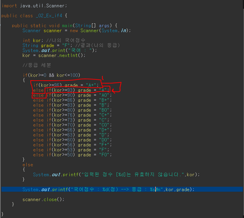 System.out.printf("국어점수 : %d(점) --> 등급 : %s\n",kor,grade);