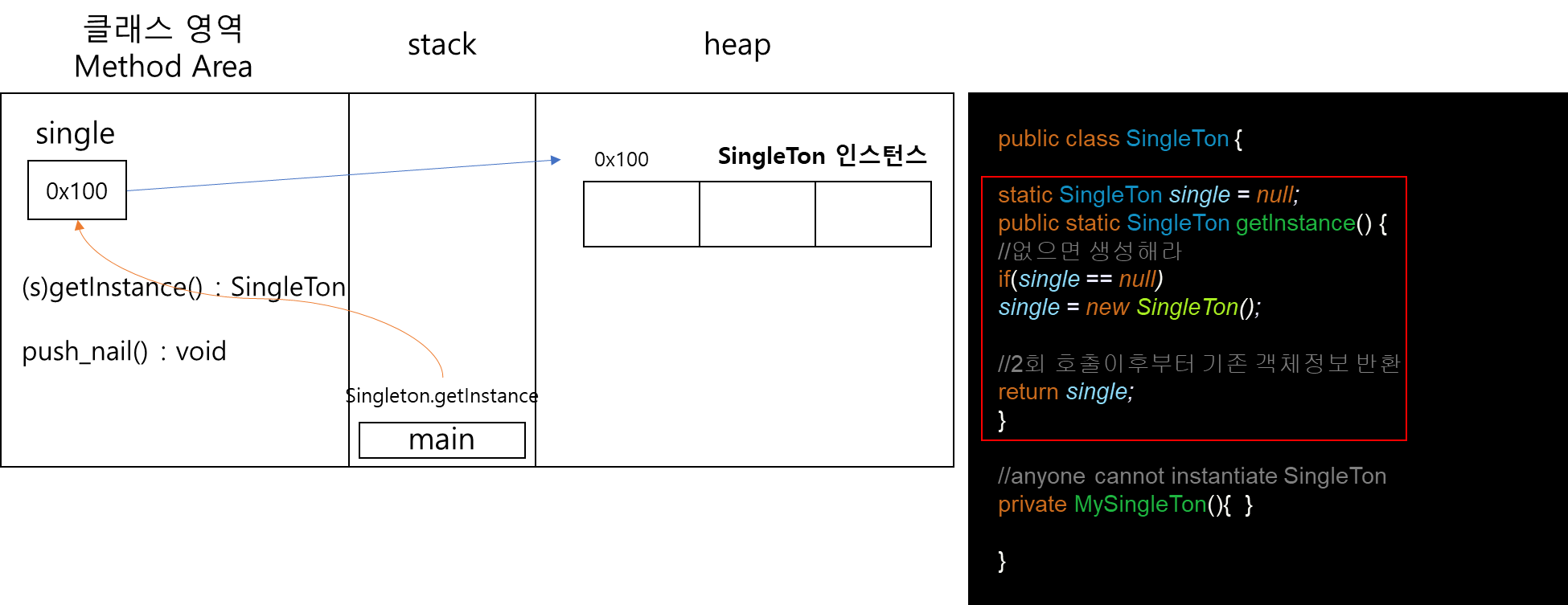 - 메소드 영역에서는 프로그램이 시작할 때 정적필드/상수, static초기화블럭/static메소드 코드가 적재되며, 객체가 생성될 때마다 instance초기화블럭/instance생성자/instance메소드가 적재된다.