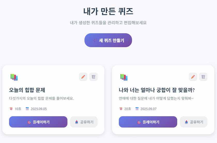 - Service : 퀴즈 게임을 만들어 친구들과 공유할 수 있는 프로그램